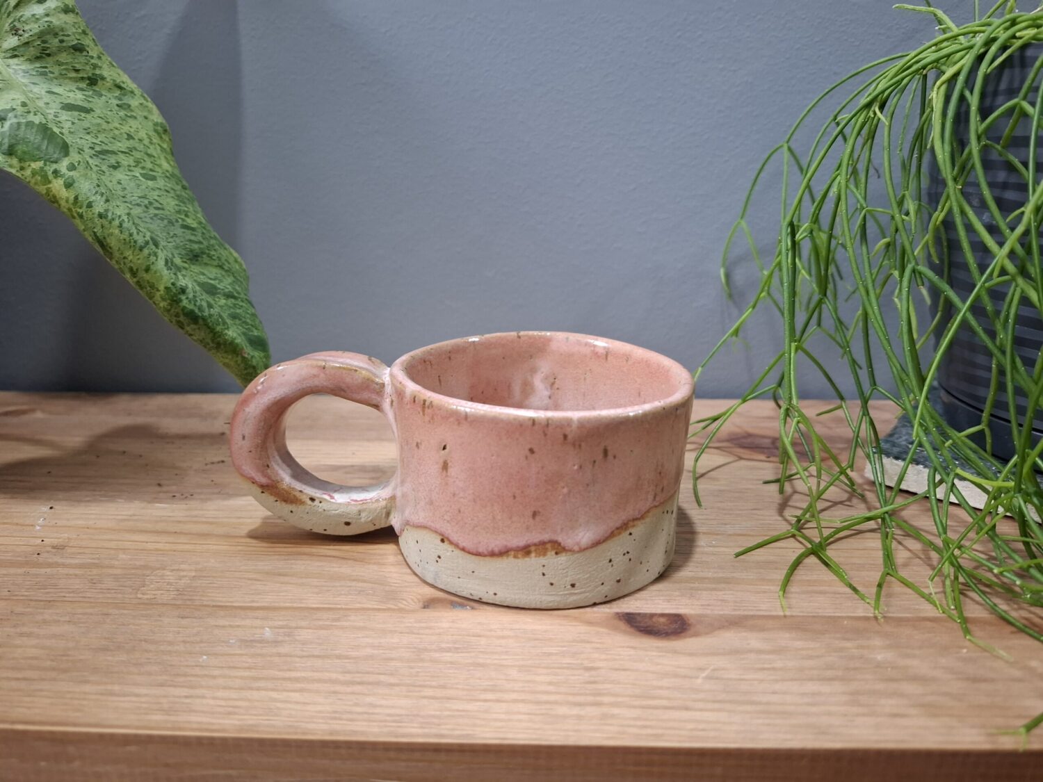Kubek  z różnymi teksturami otrzymanymi za pomocą zmieszania angoby i szkliwa.