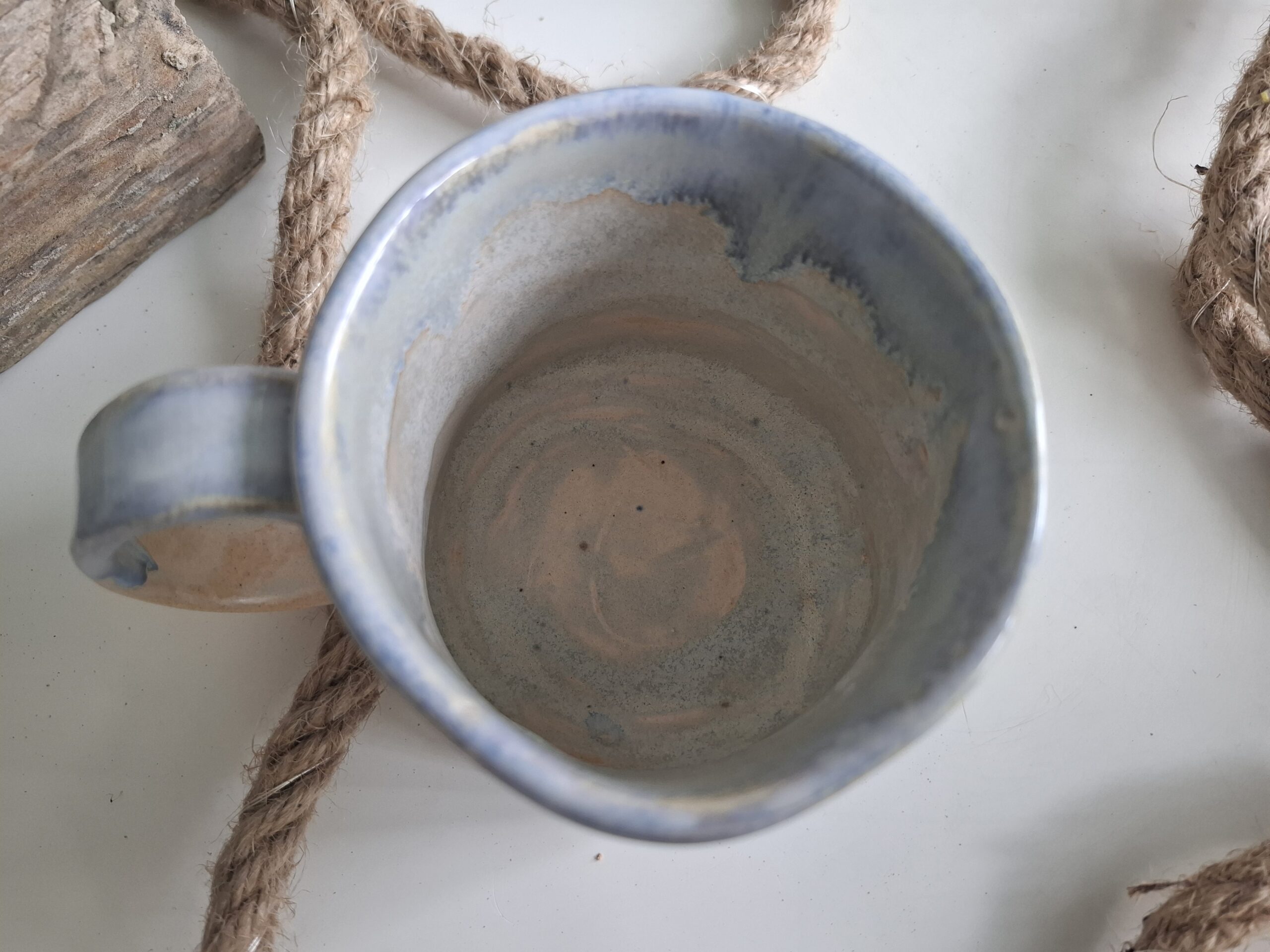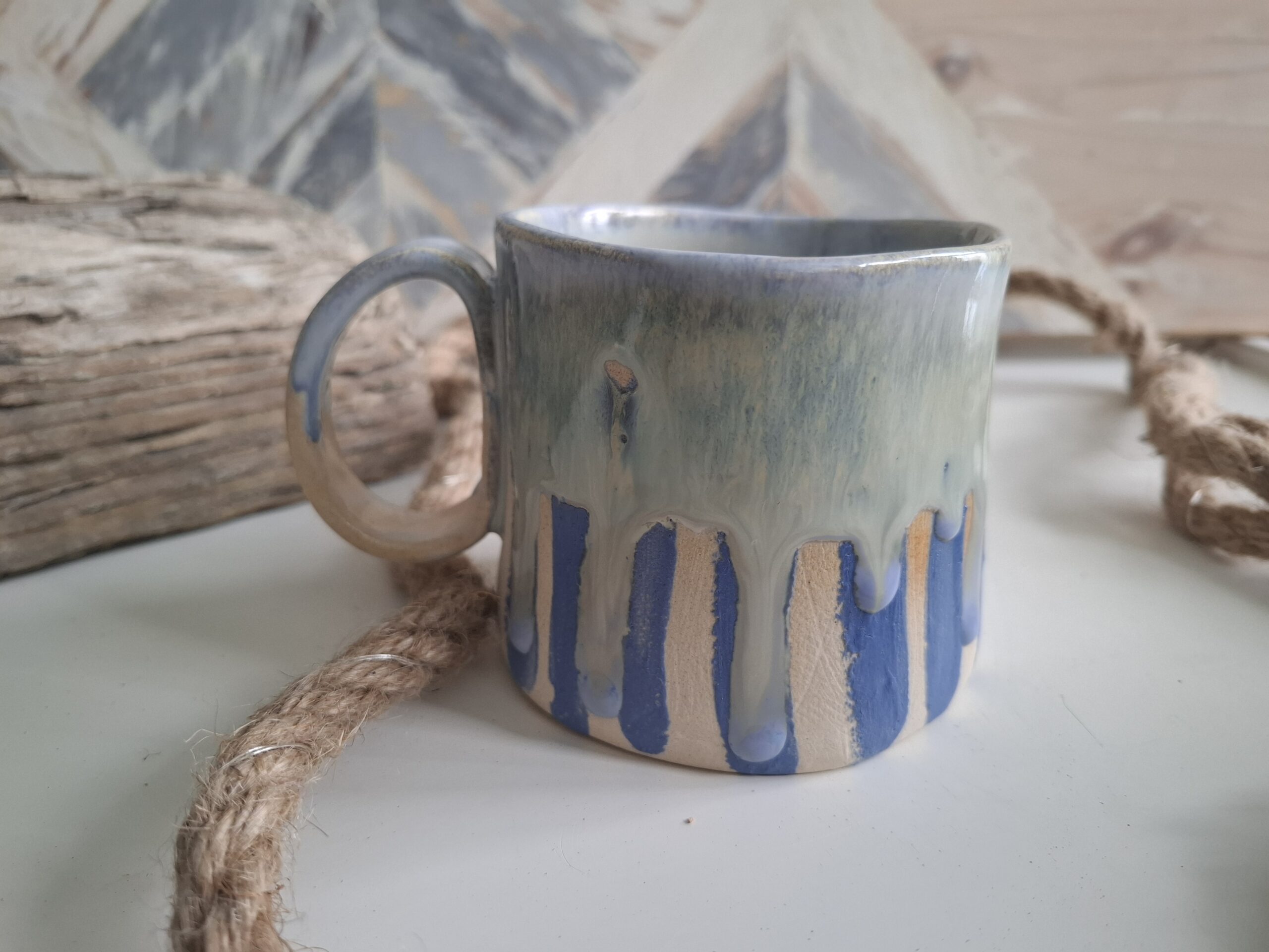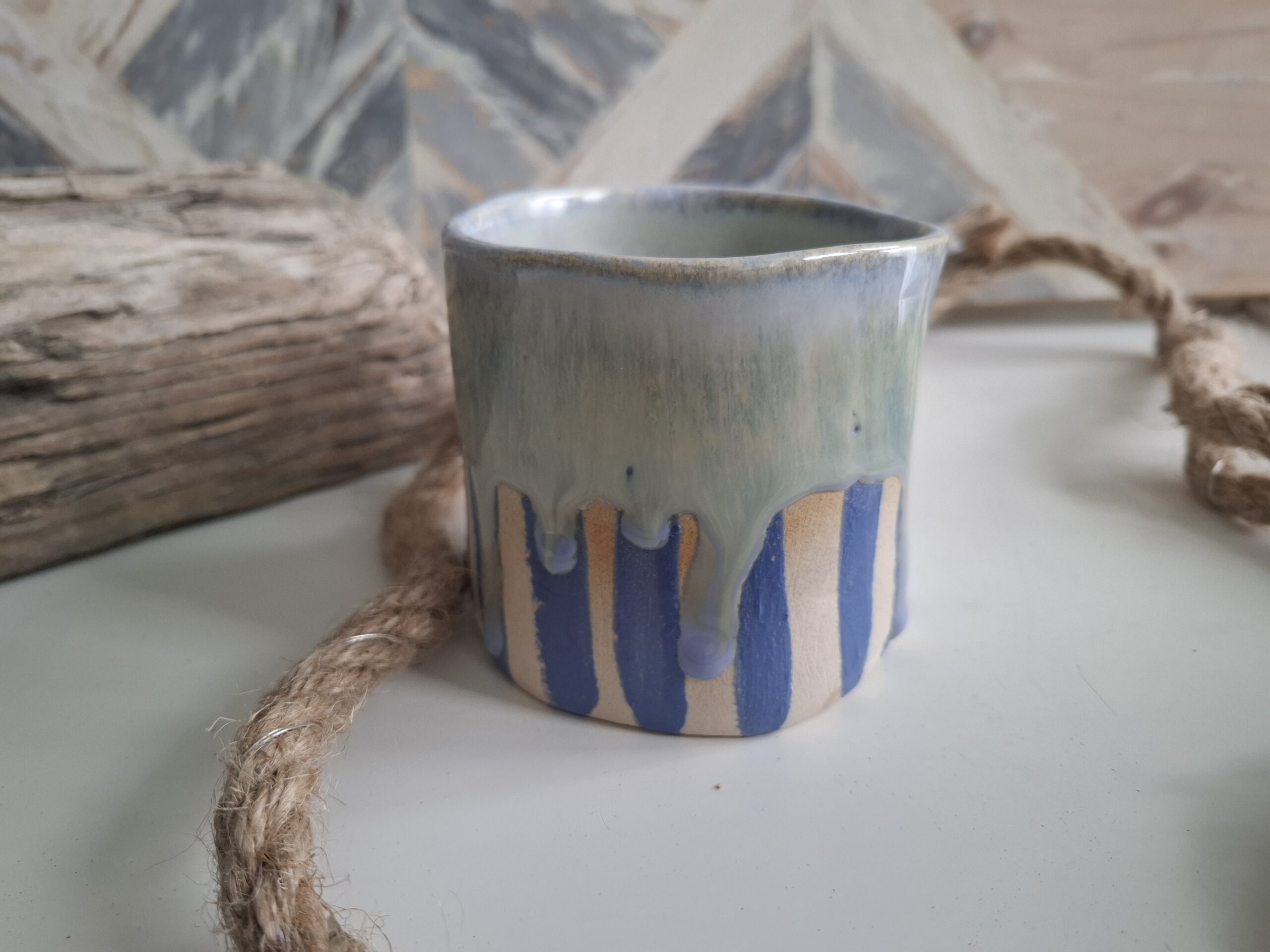 Kubek w niebieskie pasy ze spływającym szkliwem.