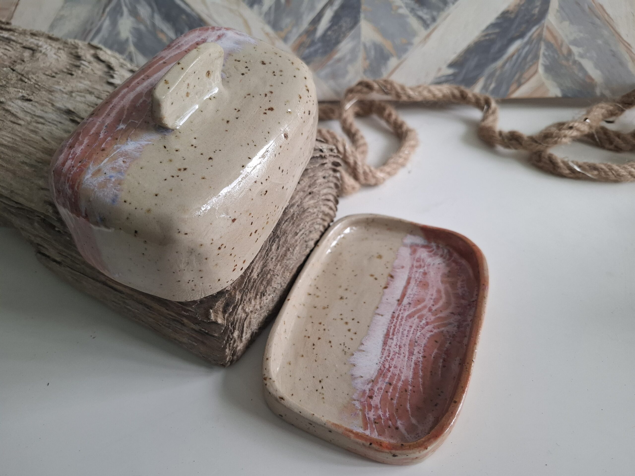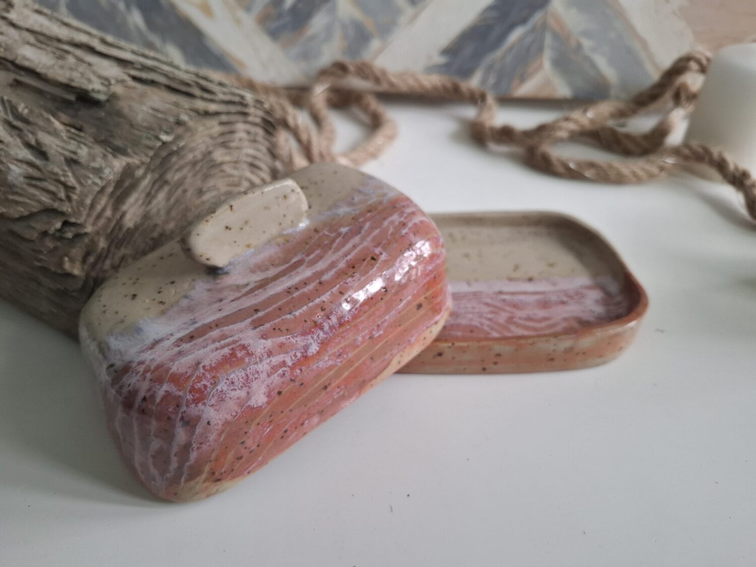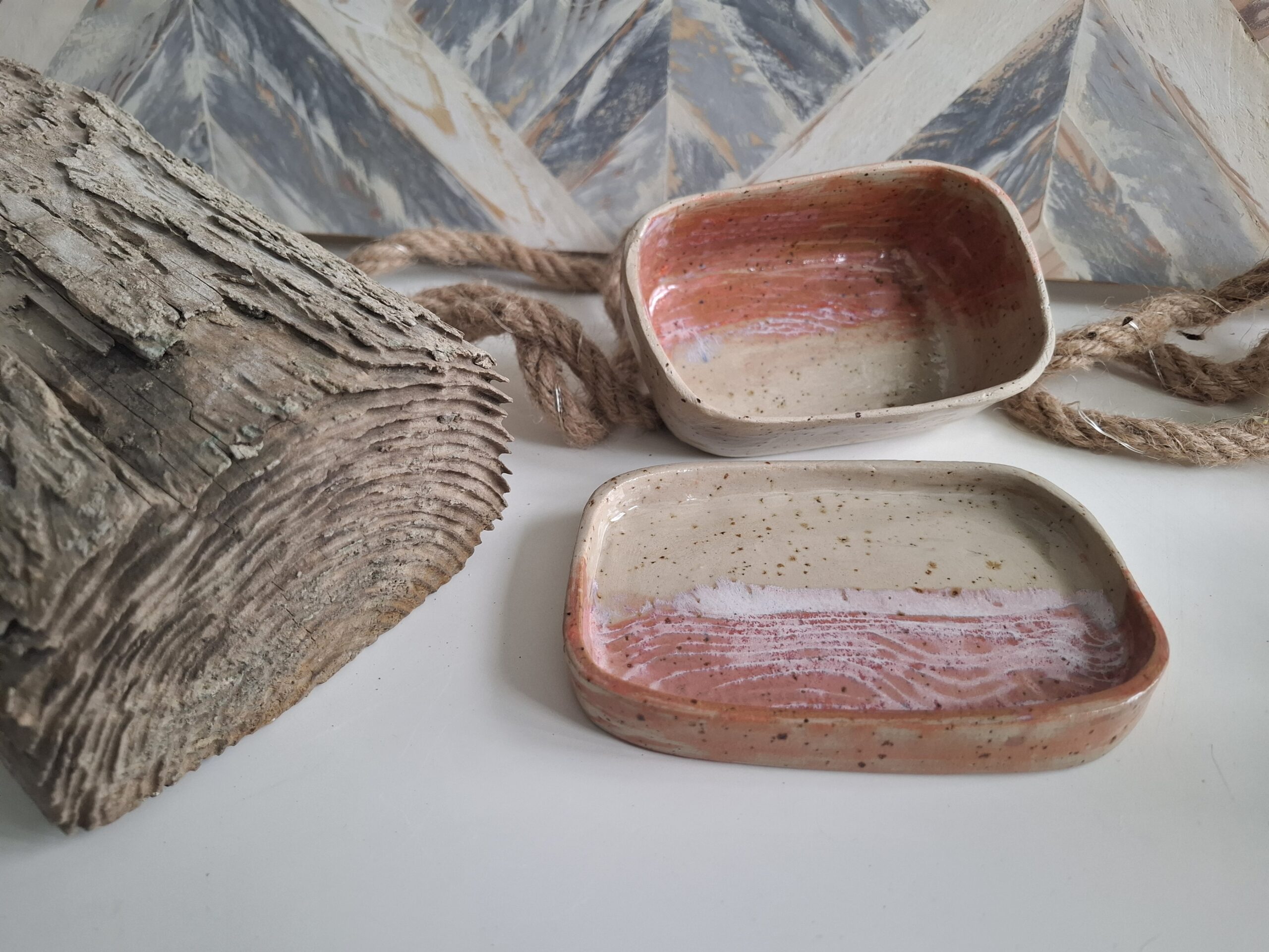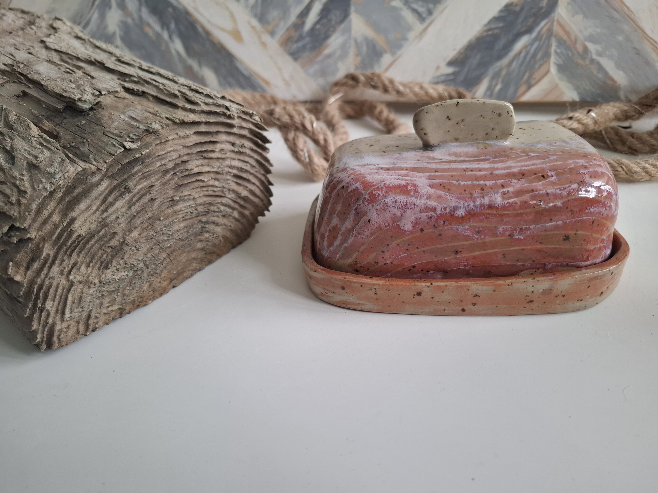 Maselniczka prostokątna z różowym szkliwem akcentowym.