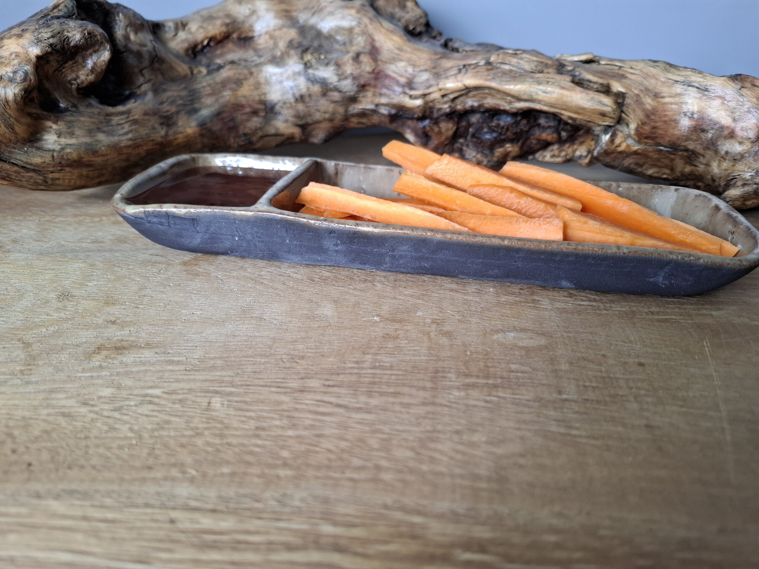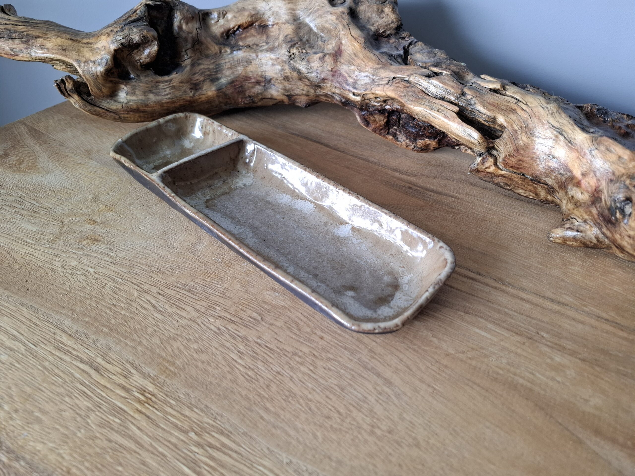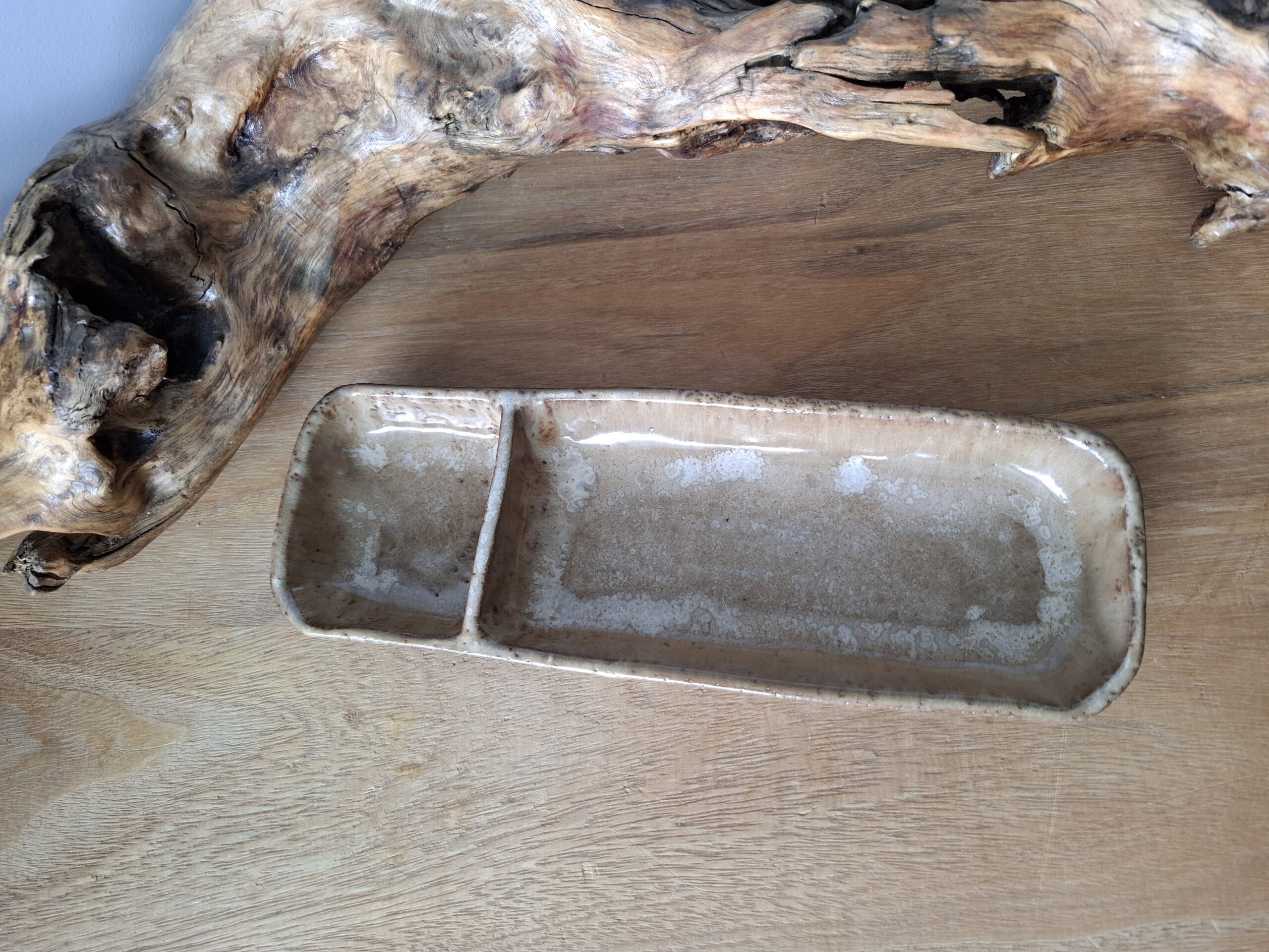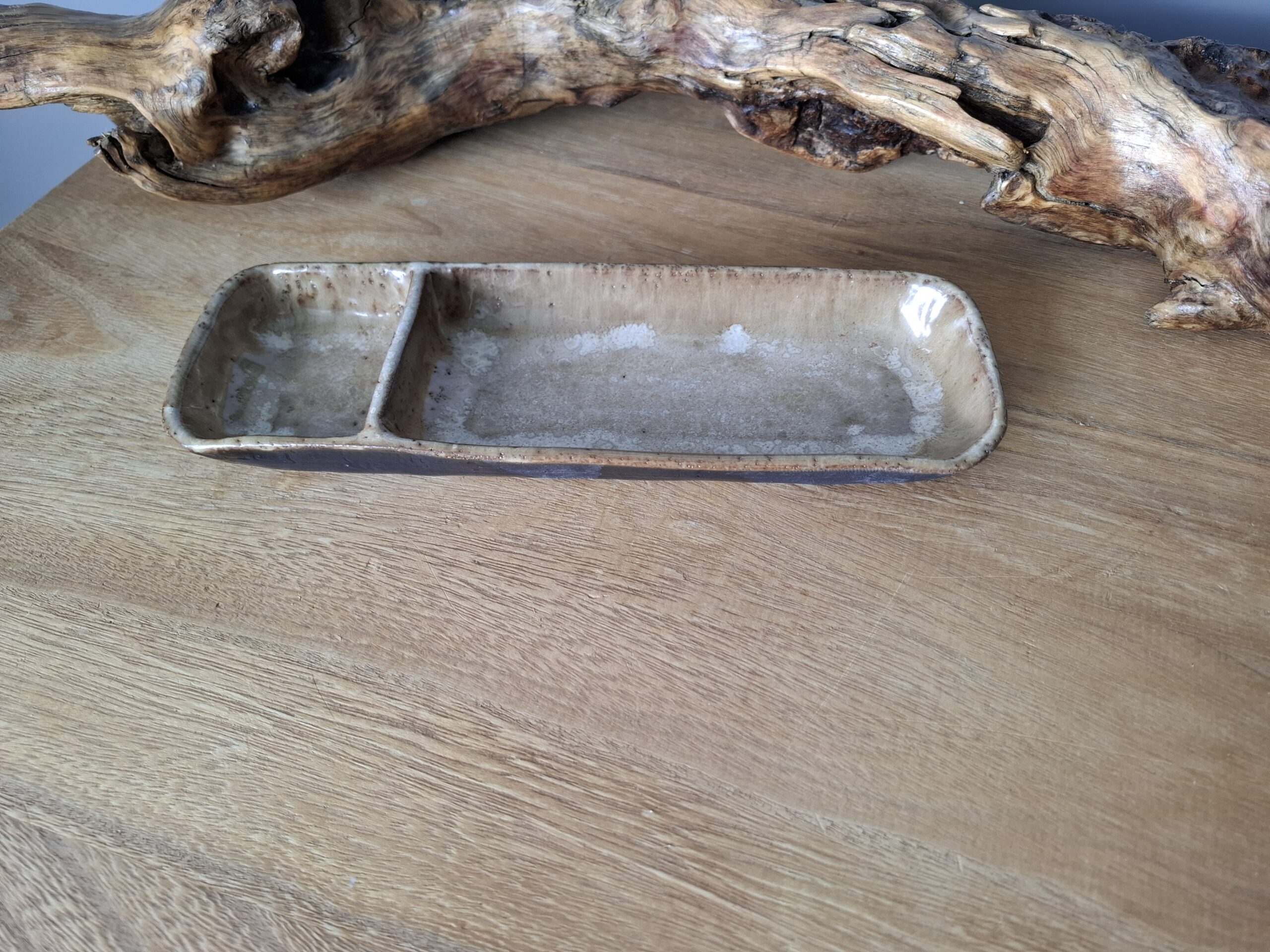 Podłużna miska w kolorze jasnego brązu z jasnymi akcentami, z przegródką.