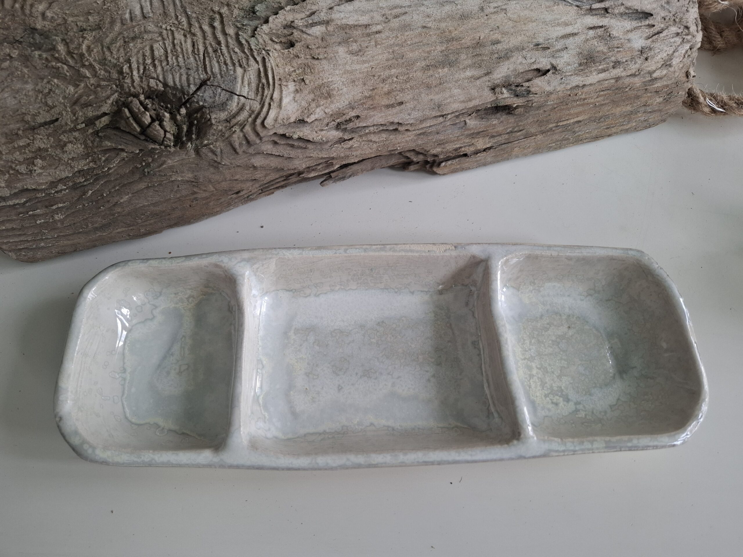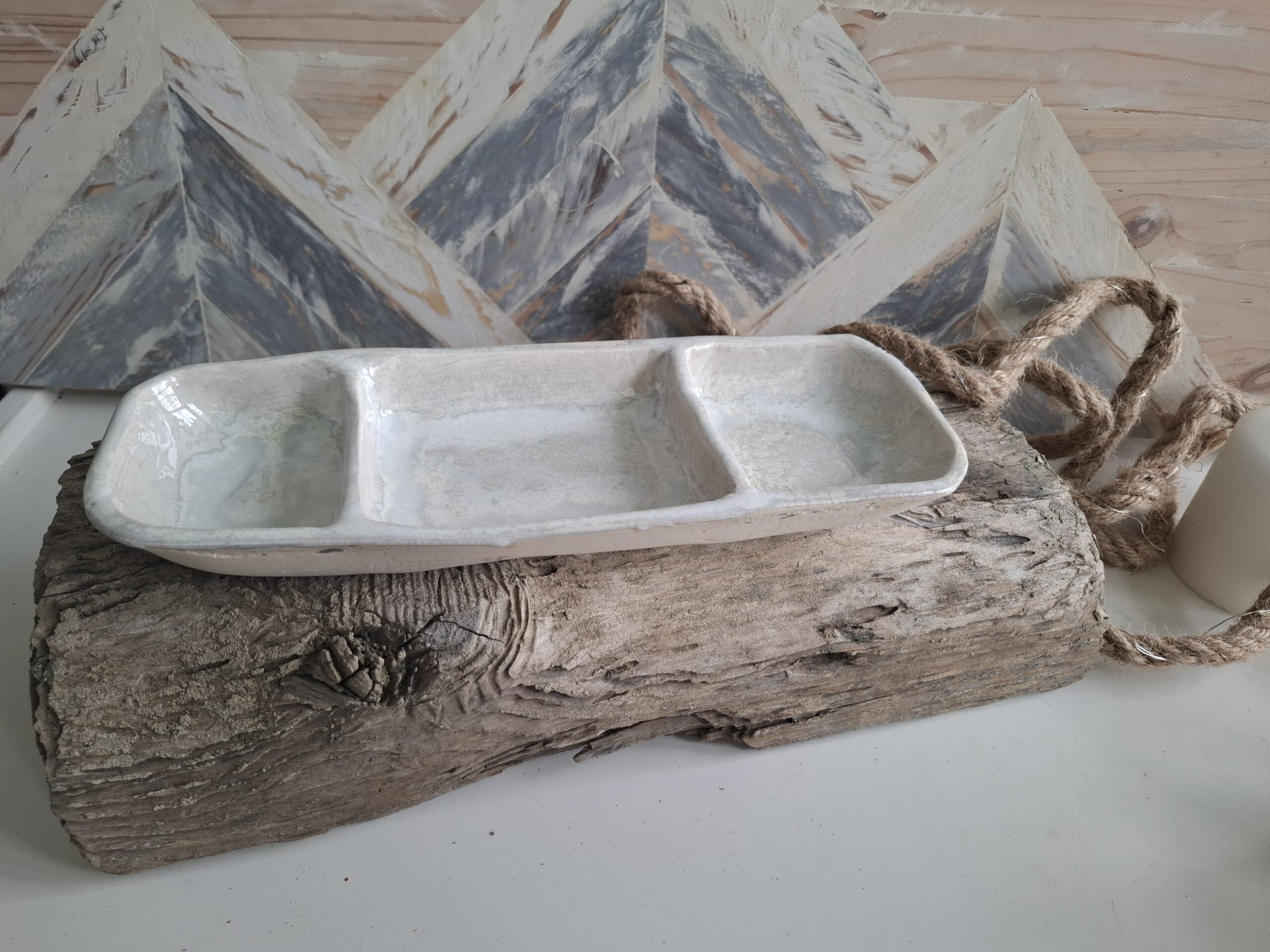 Ręcznie robiona podłużna miska z przegródkami.