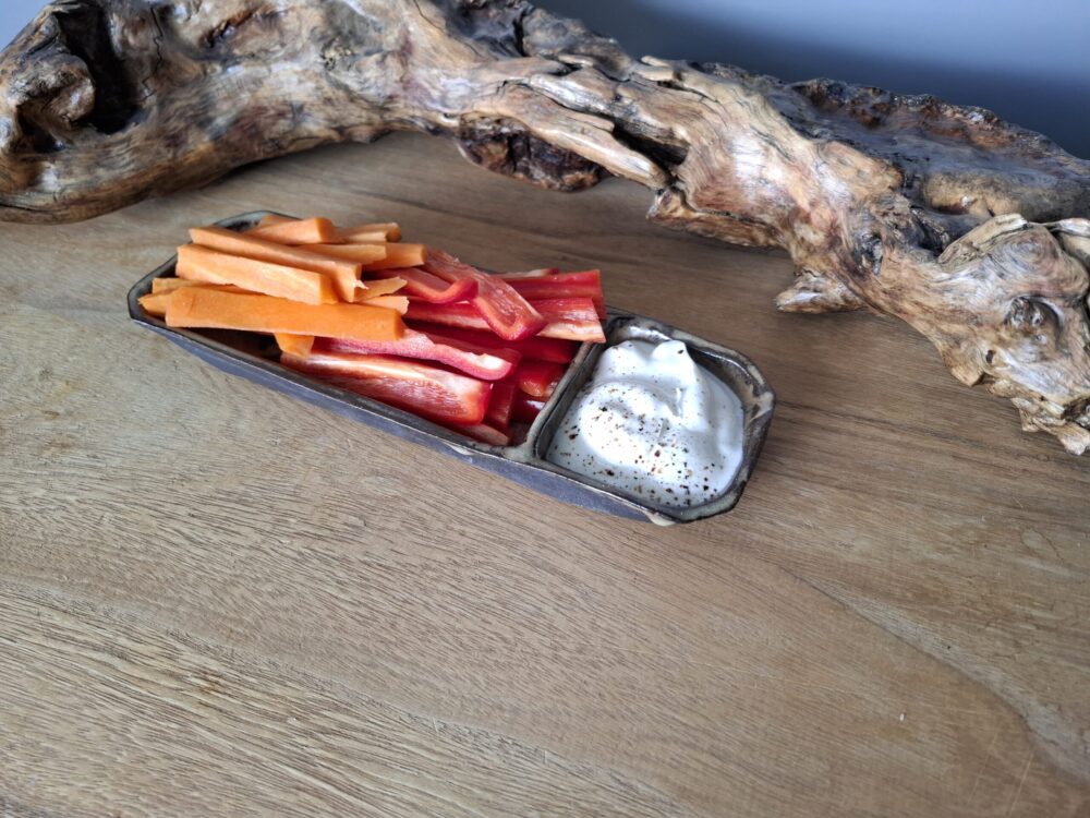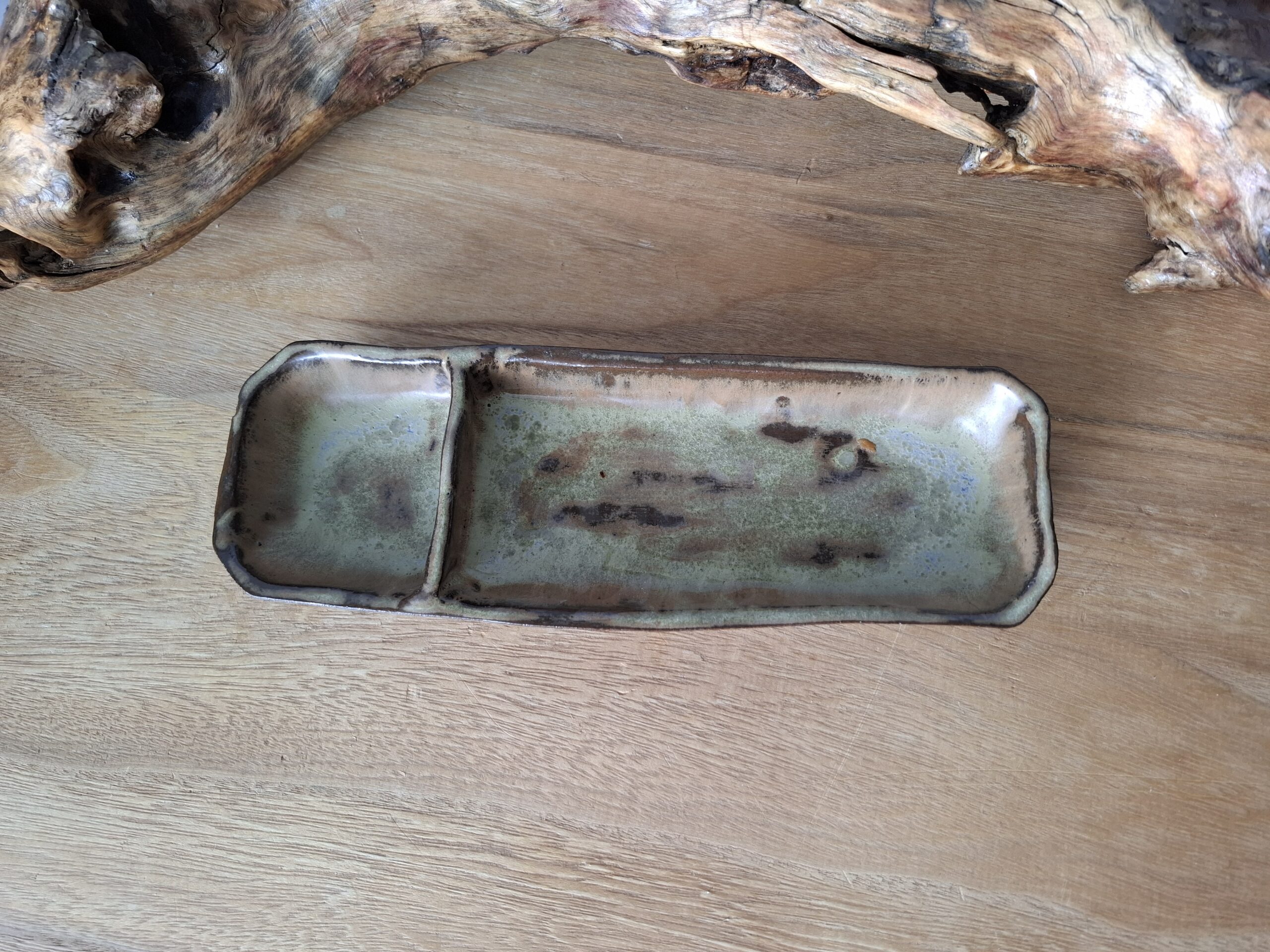 Ręcznie robiona podłużna miska w stylu rustykalnym z przegródką.