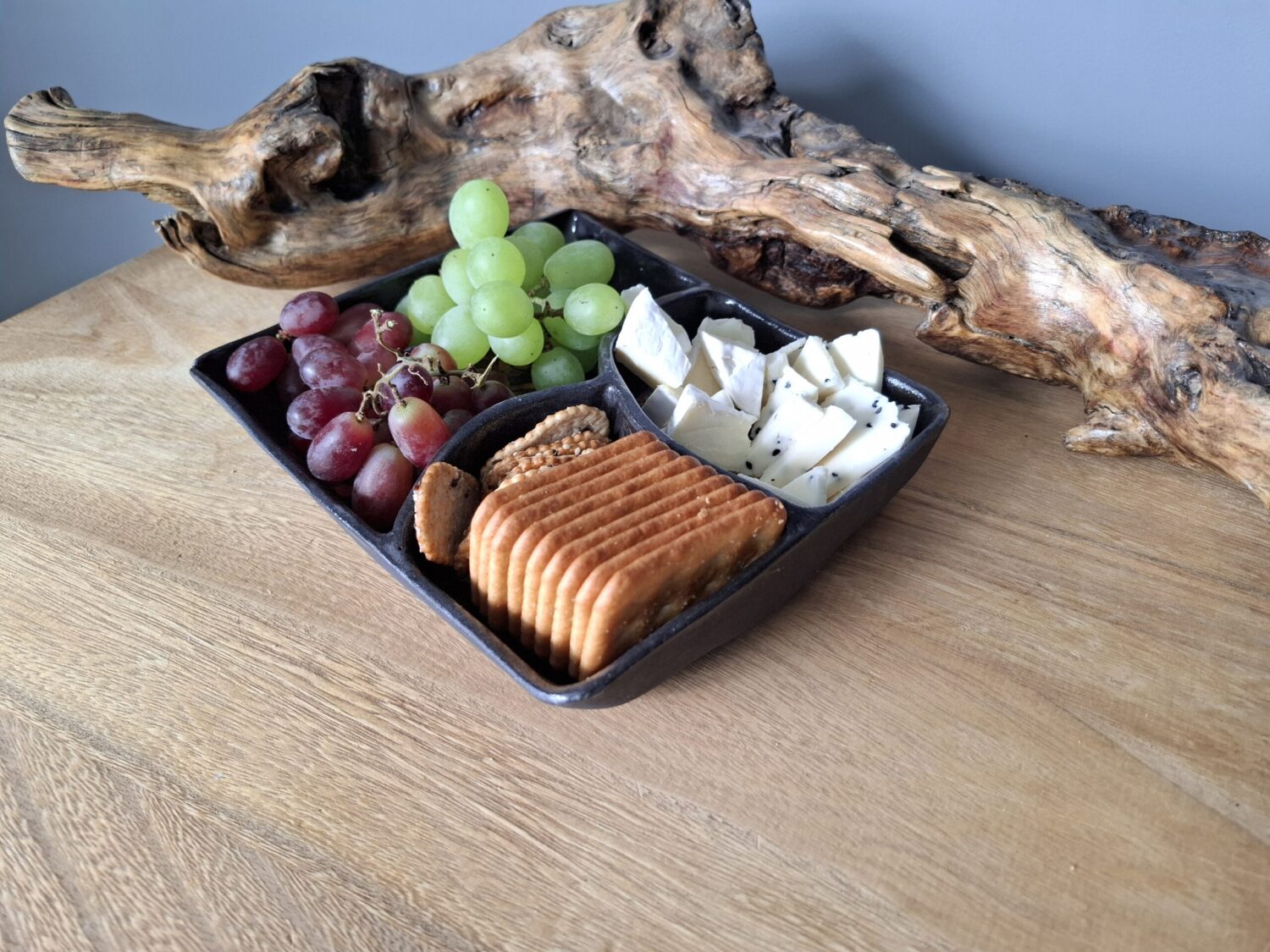 Podłużna miska w kolorze szarym z przegródkami.