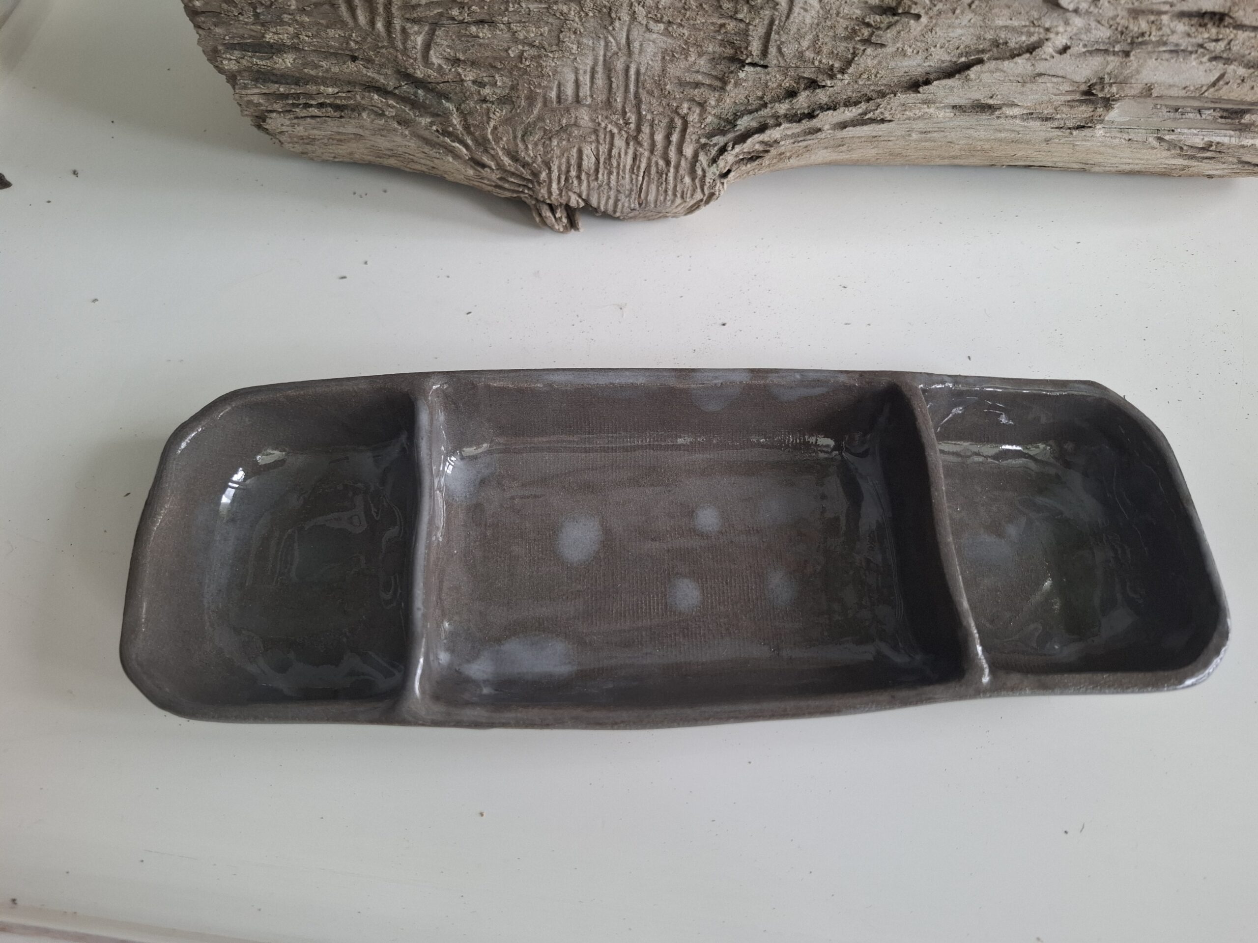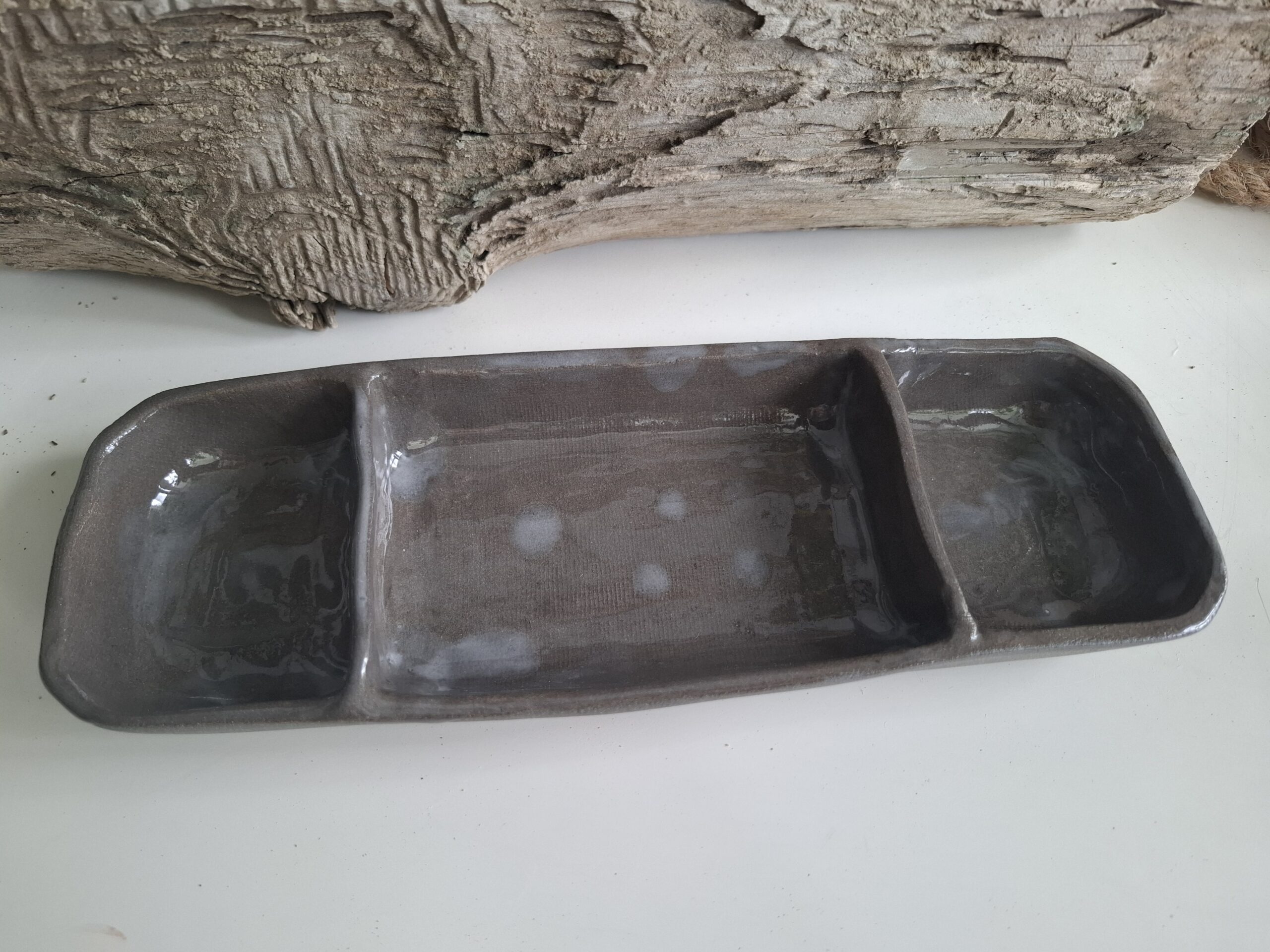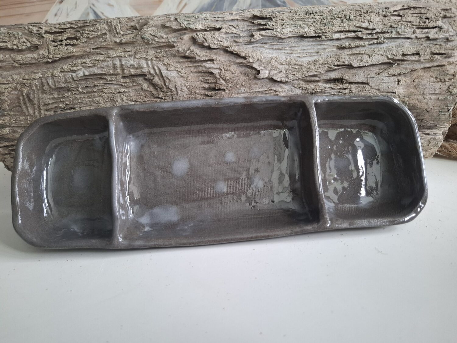Ręcznie robiona podłużna miska z przegródkami.