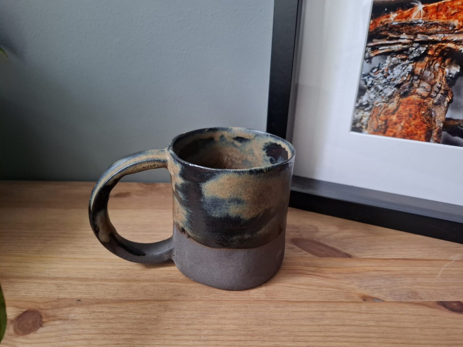 Kubek z dużym uchem o rustykalnym wyglądzie w kolorach brązu.