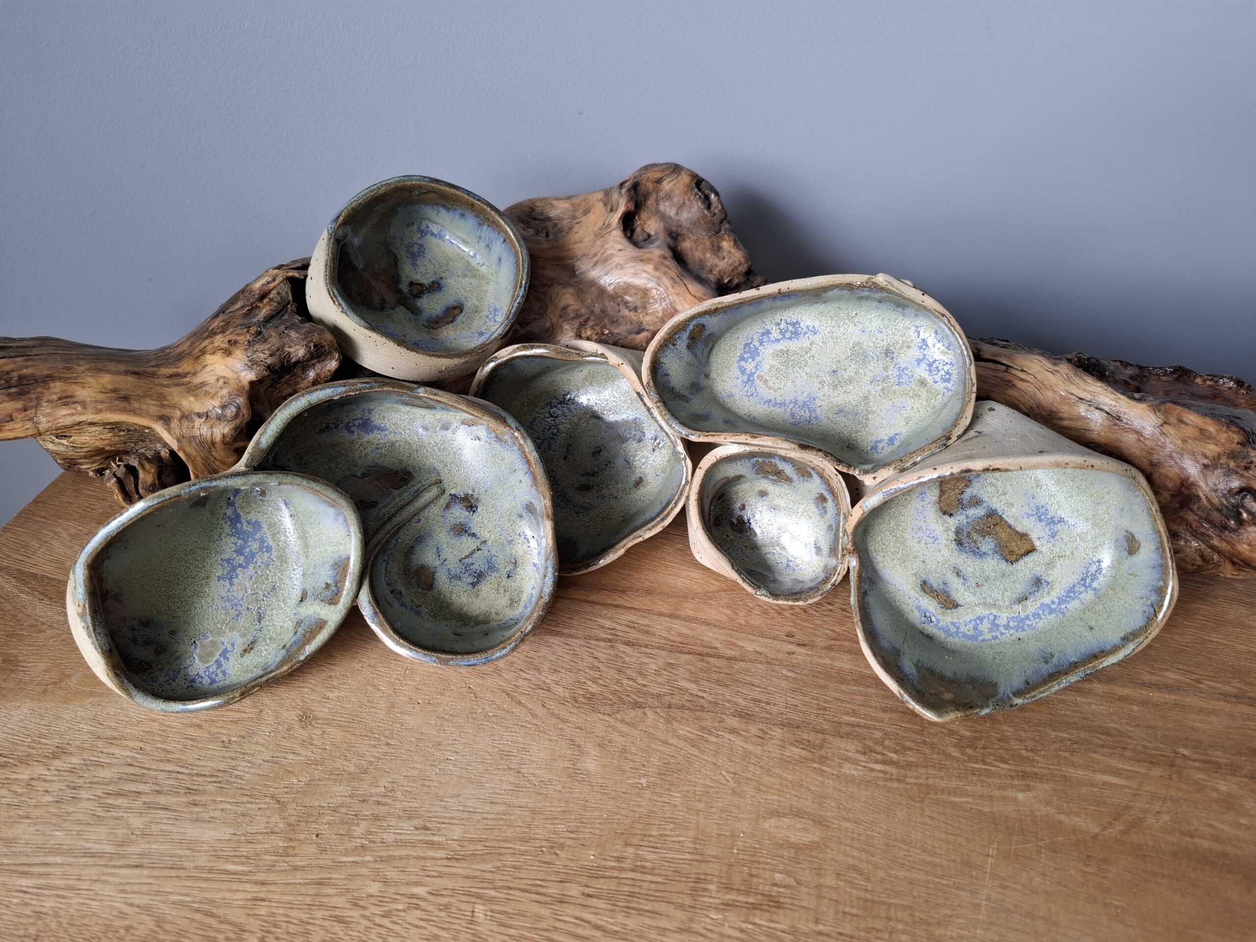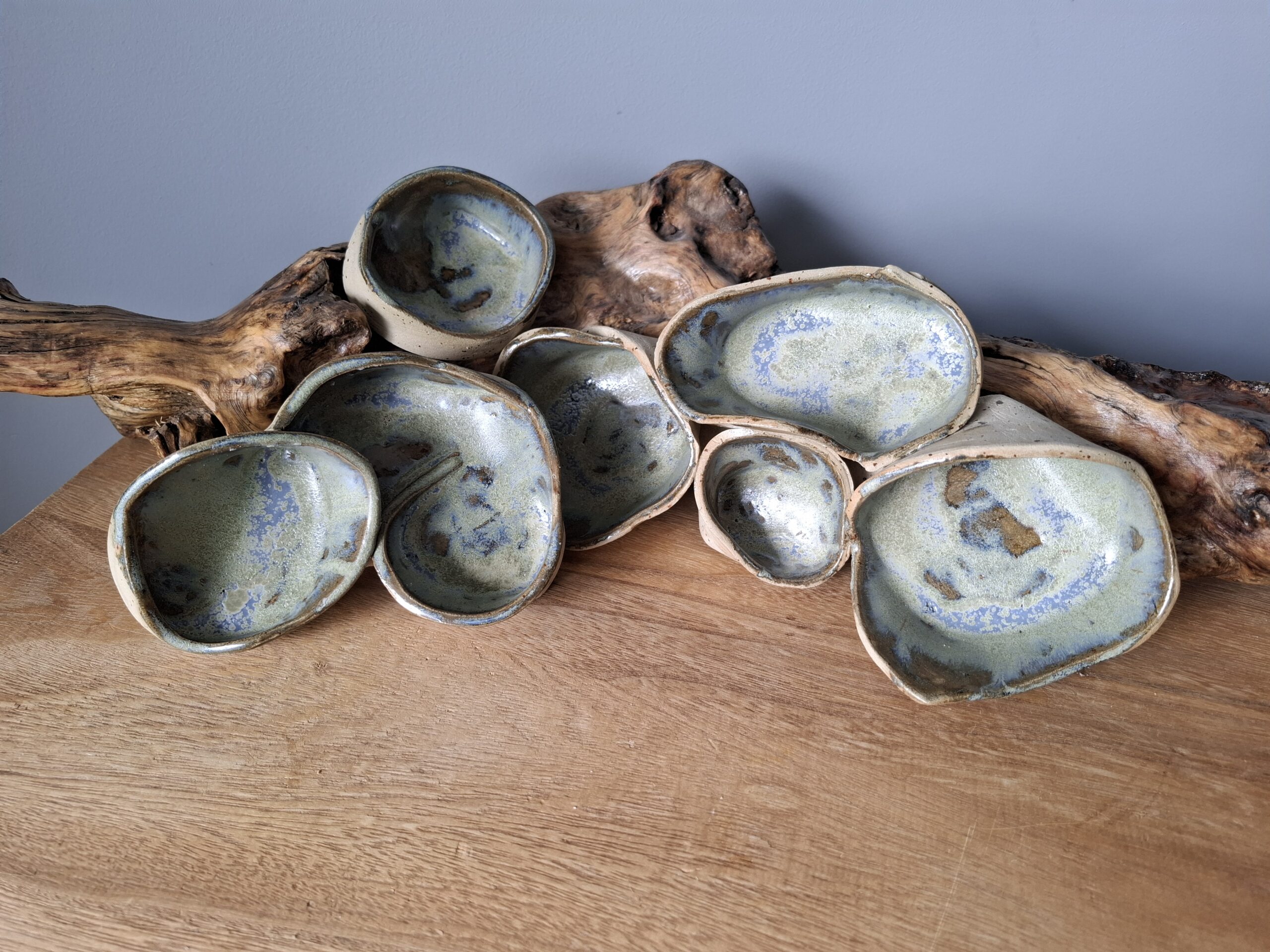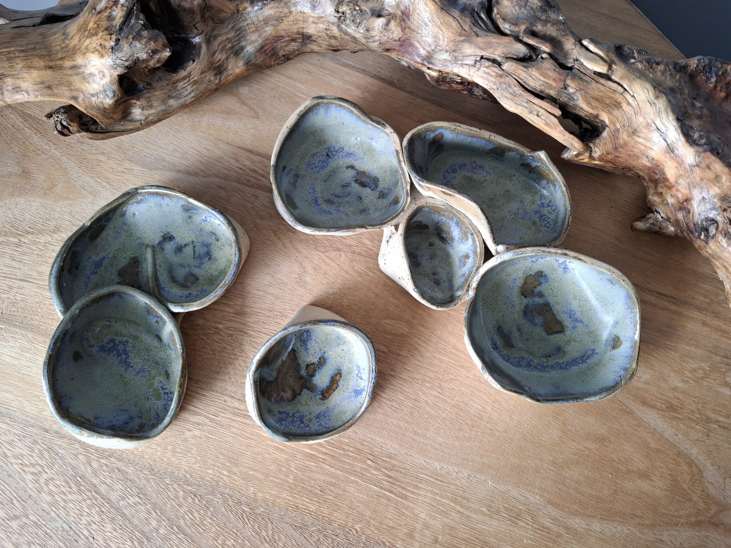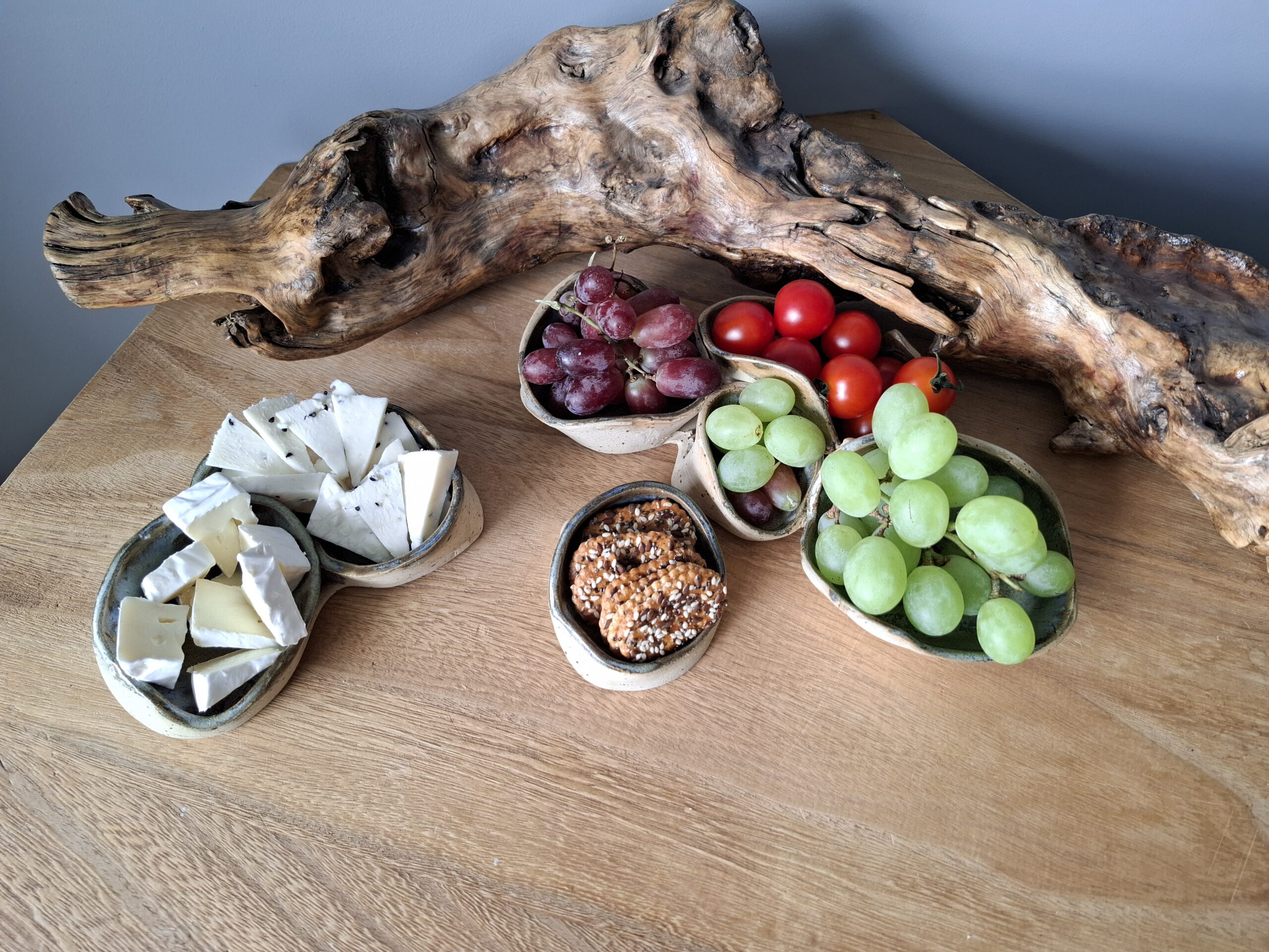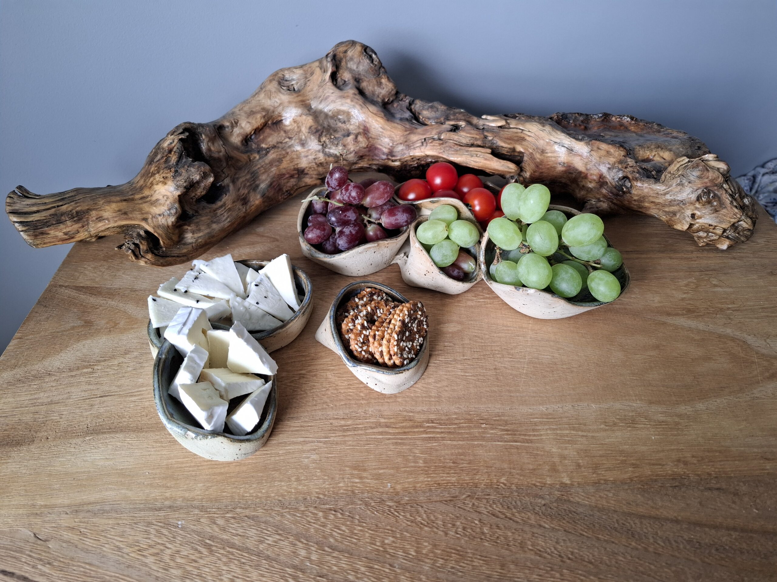 Ręcznie robiony zestaw asymetrycznych miseczek z przegródkami.