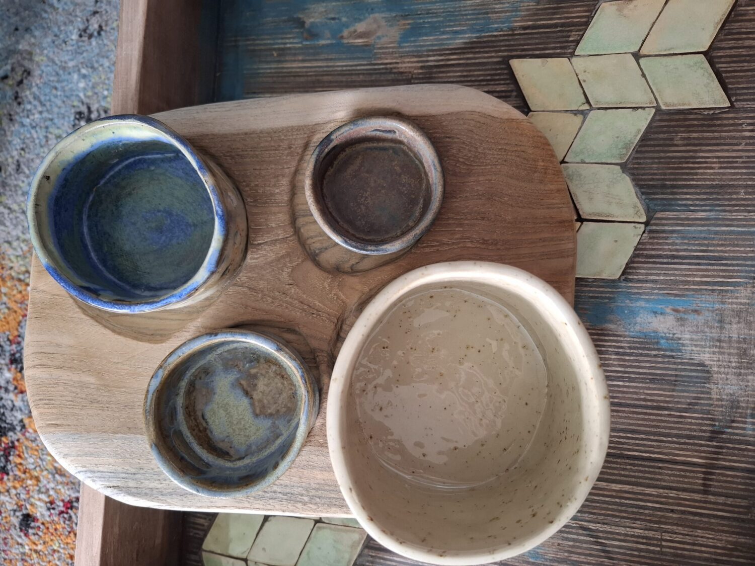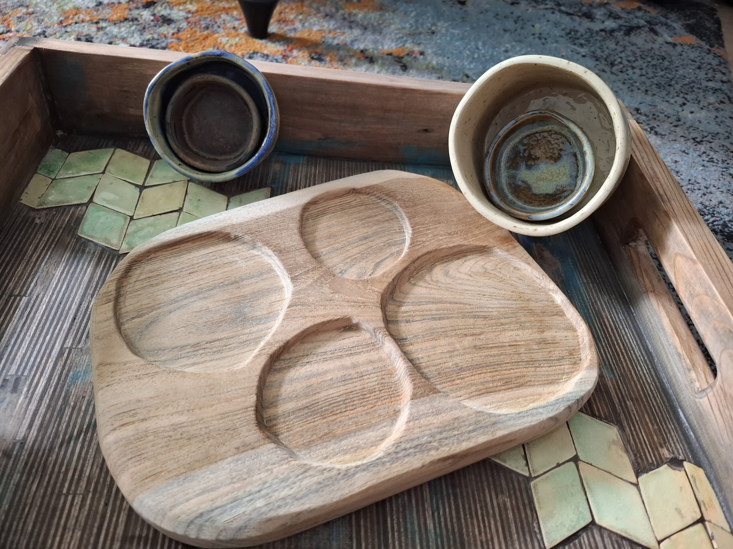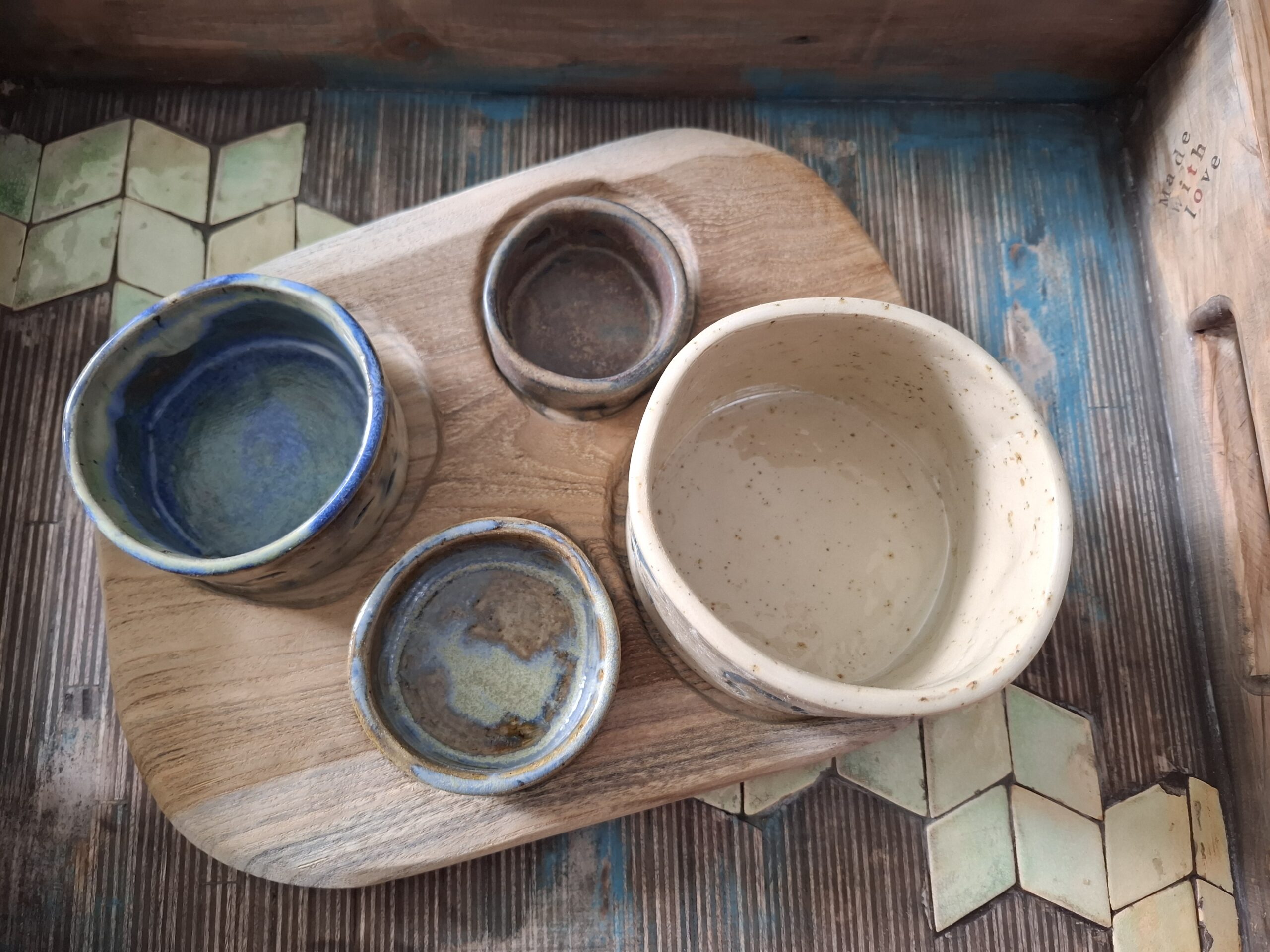 Ręcznie robione miseczki ceramiczne na tacy z drewna mango.